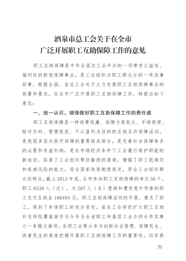 中共酒泉市委办公室酒泉市人民政府办公室关于印发《市总工会关于在全市广泛开展职工互助保障工作的意见》的通知