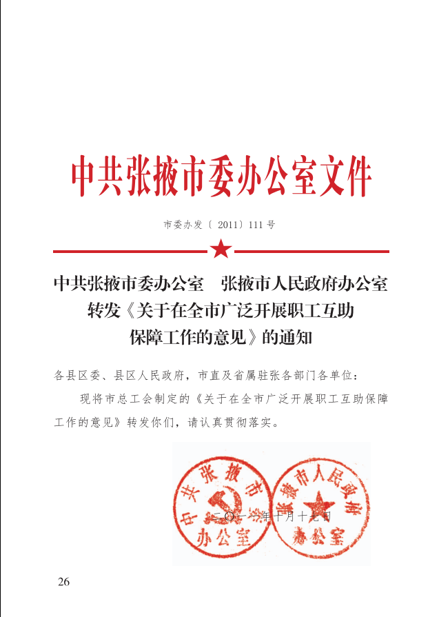 中共张掖市委办公室张掖市人民政府办公室转发《关于在全市广泛开展职工互助保障工作的意见》的通知