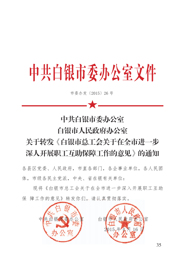 中共白银市委办公室白银市人民政府办公室关于转发《白银市总工会关于在全市进一步深入开展职工互助保障工作的意见》
