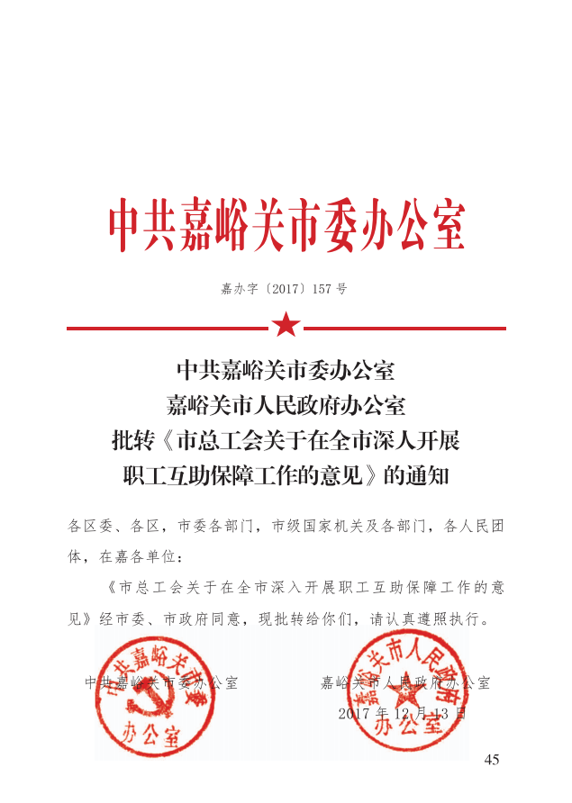 中共嘉峪关市委办公室嘉峪关市人民政府办公室批转《市总工会关于在全市深入开展职工互助保障工作的意见》的通知