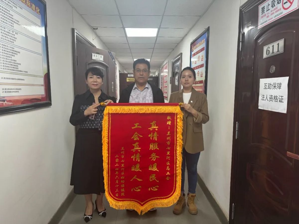 近日,兰州市七里河区妇幼保健院职工胥某及单位的工会负责人将一面写着“真情服务暖民心,工会真情暖人心”的锦旗送到了七里河区总工会职工互助办公室。