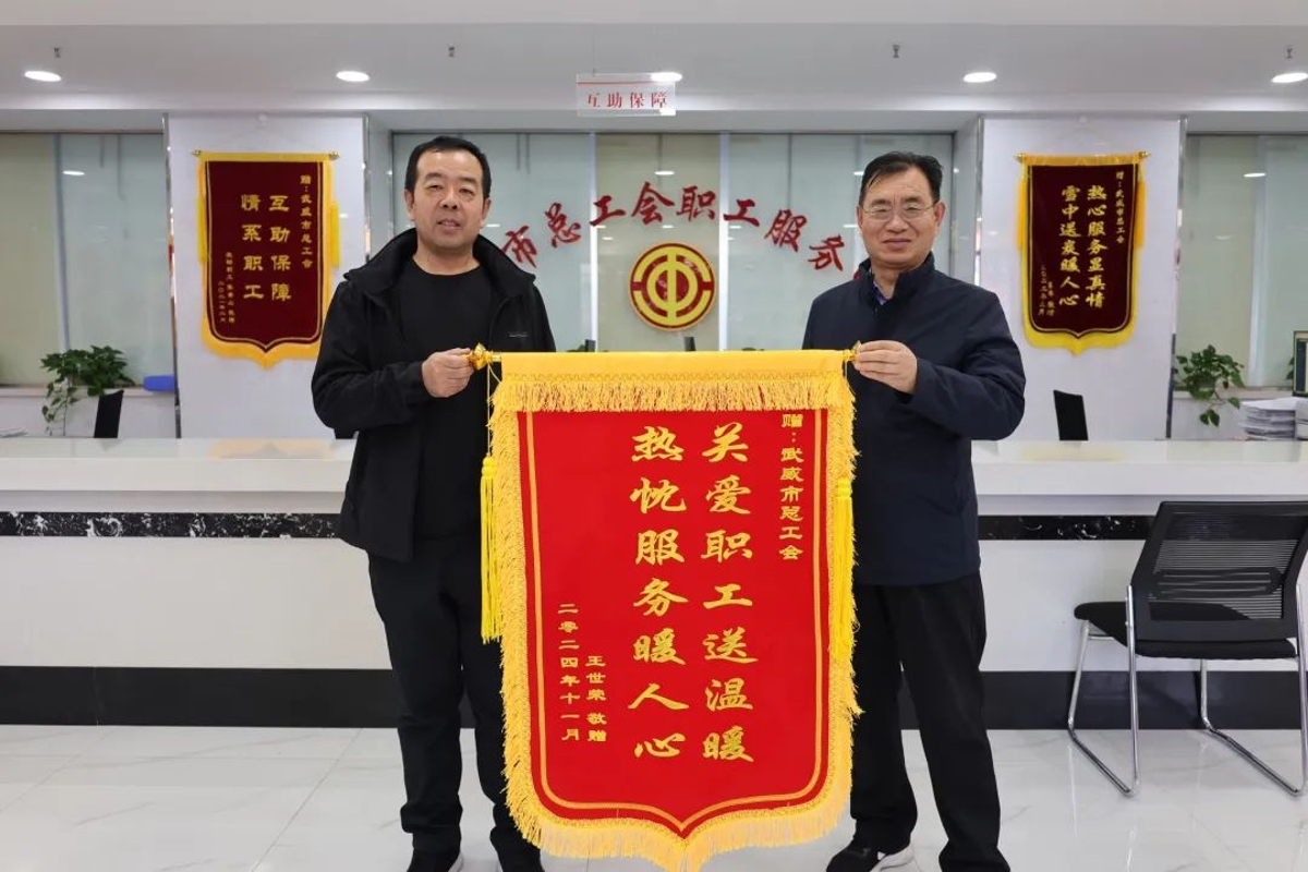近日,武威市总工会职工服务中心迎来了一位特别的访客——响煤集团武威选煤公司王先生。他将一面写着“关爱职工送温暖 热忱服务暖人心”的锦旗赠予市总工会,以此表达对市总工会感激之情。市总工会经费审查委员会主任刘文堂代表市总工会接收了这面锦旗。