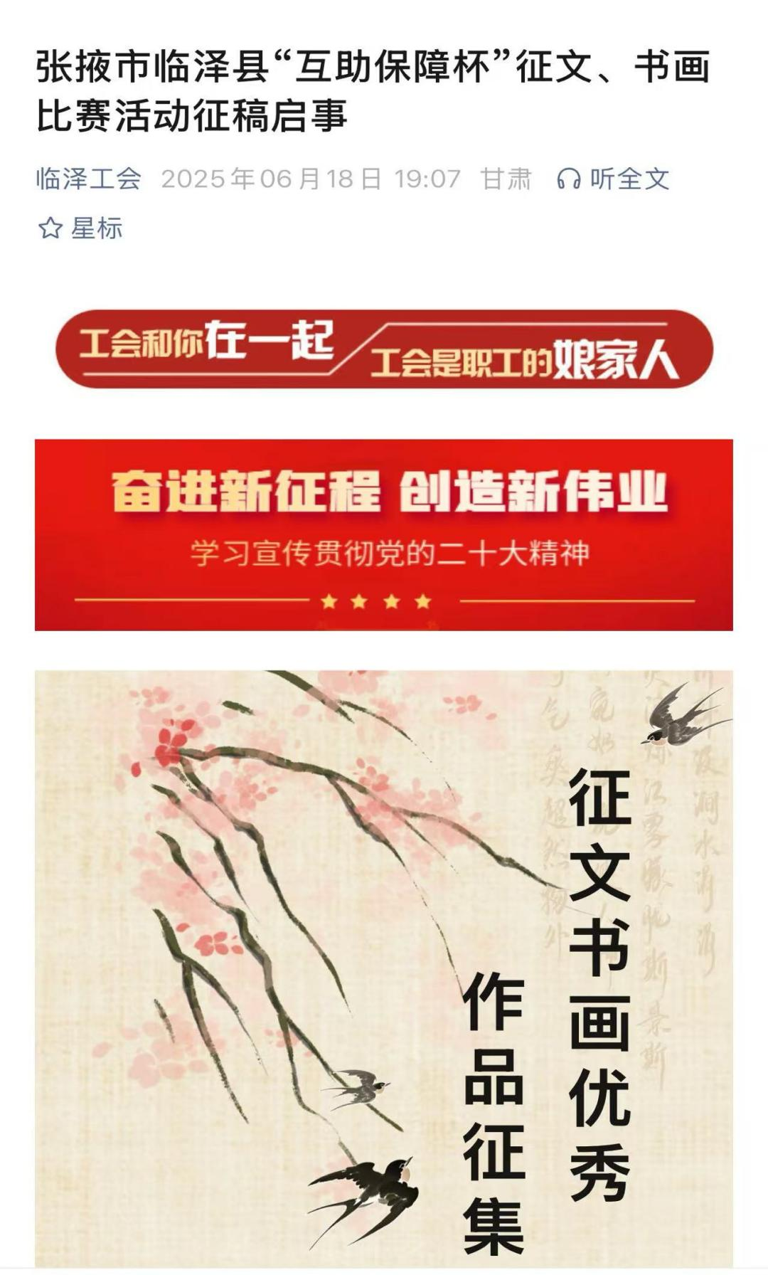 为热烈庆祝中华全国总工会成立100周年,进一步扩大职工互助保障工作的影响力和知晓率,近日,中国职工保险互助会兰州办事处冠名了张掖市临泽县“互助保障杯”征文书画比赛。此项活动以“致敬劳动者、赞美劳动、歌颂劳模工匠”为主题,征集展现工人阶级时代风采、弘扬“劳模精神、劳动精神、工匠精神”的优秀作品。比赛时间为2025年5月至12月,征稿分征文、书法、美术三类,对体裁、尺寸、内容等均有具体要求。获奖作品将在工人文化宫、劳动文化公园、劳模工匠室等工会宣传阵地展出。